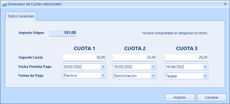 En el menú “Más…” aparecerá la opción “Generar Cuotas Adicionales…”. Solo se muestra en vencimientos de actividad, pendiente de pago, facturado y si no tiene cuotas ya generadas.