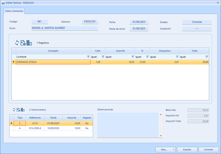 - Emisión de factura de vencimiento “sin cobro”: opción disponible en la ficha del vencimiento.