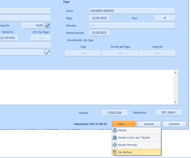 Esta mejora resulta útil en la gestión administrativa y en la comunicación con los socios, ya que el documento de recibo contiene toda la información relevante en un solo lugar. Por ejemplo, permite al socio identificar claramente la factura relacionada con su pago y disponer de un justificante válido que incluye sus datos personales y fiscales de manera más transparente.