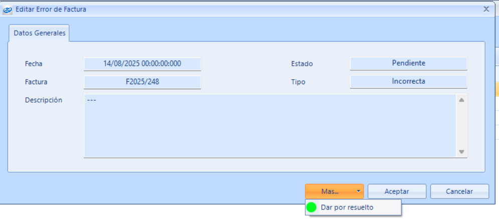 - Resolver: una vez actualizada la información se debe volver al mensaje de error y en el menú “Más…” usar la opción “Dar por resuelta”. A partir de aquí el sistema, de forma autónoma, volverá a enviar la información a la AEAT para su validación.
