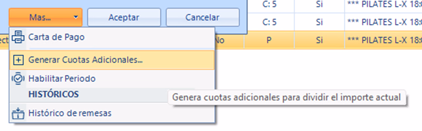 En el menú “Más…” aparecerá la opción “Generar Cuotas Adicionales…”. Solo se muestra en vencimientos de actividad, pendiente de pago, facturado y si no tiene cuotas ya generadas.