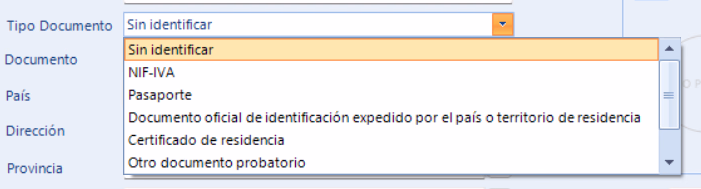 - Tipo de Documento: permite seleccionar entre los tipos reconocidos oficialmente (NIF, NIE, CIF, Pasaporte, etc.). Dependiendo de guardar el tipo, el sistema define si los campos Documento y País son obligatorios.