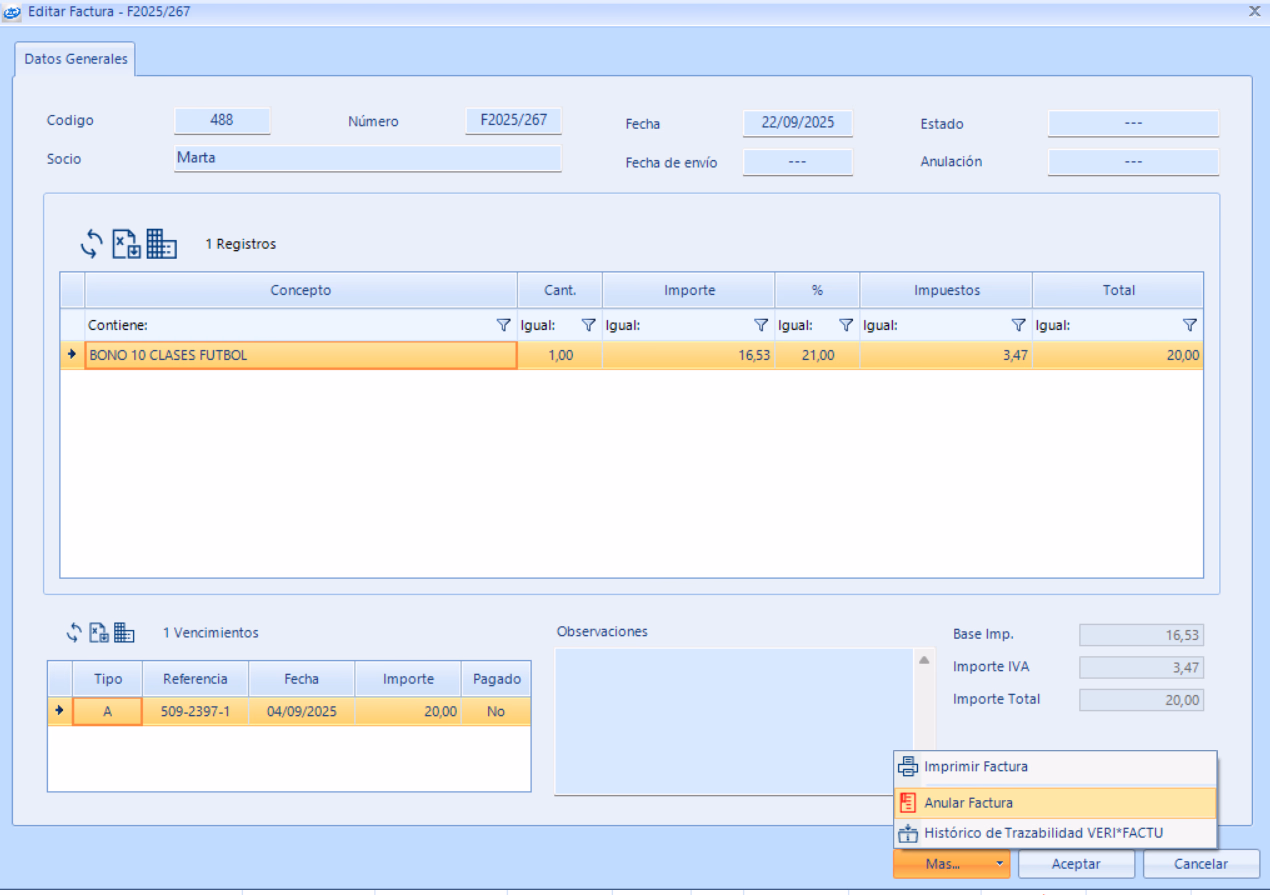 - Anular Factura: opción disponible en el menú “Más…”. En el caso de que se pueda anular (nunca eliminar) una factura se dispondrá de esta opción. Si no se trabaja con VERI*FACTU la anulación es directa. En caso contrario se esperará a la comunicación de la AEAT mostrando el estado en el campo “Anulación”.