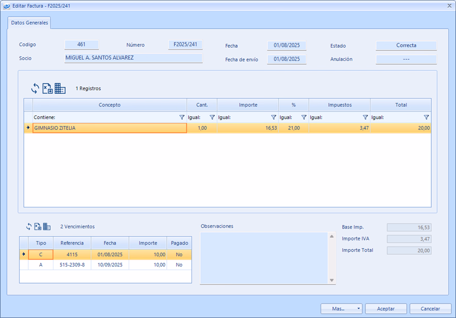 En la emisión del recibo de vencimiento se incluyen ahora tres novedades principales: se agrega el documento identificativo del socio en el apartado de datos personales, se sustituyen las referencias a “IVA” por el término “Impuestos”, y se incorpora la factura vinculada al vencimiento en caso de que exista. Estos cambios se reflejan automáticamente al generar el recibo en cualquiera de sus formatos.