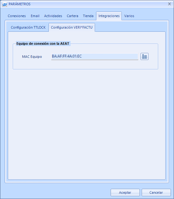 Desde el botón de ZCenter, ubicado en la parte superior izquierda de la aplicación, accede a la opción Parámetros. Se abrirá un formulario en el que deberás ingresar a la pestaña Integraciones. En esta sección, se ha incorporado una pestaña «Configuración VERI*FACTU» en el cual hay que indicar la dirección MAC del equipo encargado de la comunicación con la AEAT.