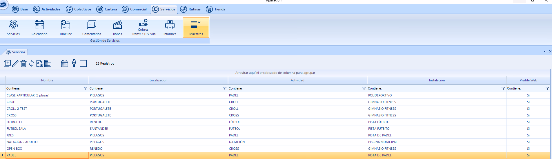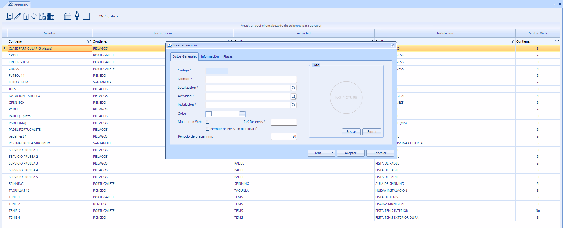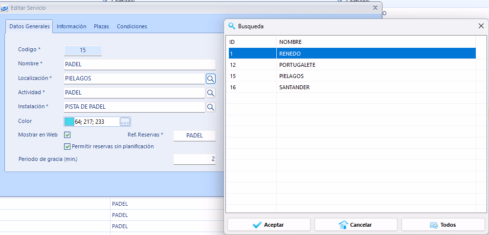 - Localización: En la parametrización previa se crearon unas localizaciones, que se seleccionara a la hora de crear el Servicio de Reserva.