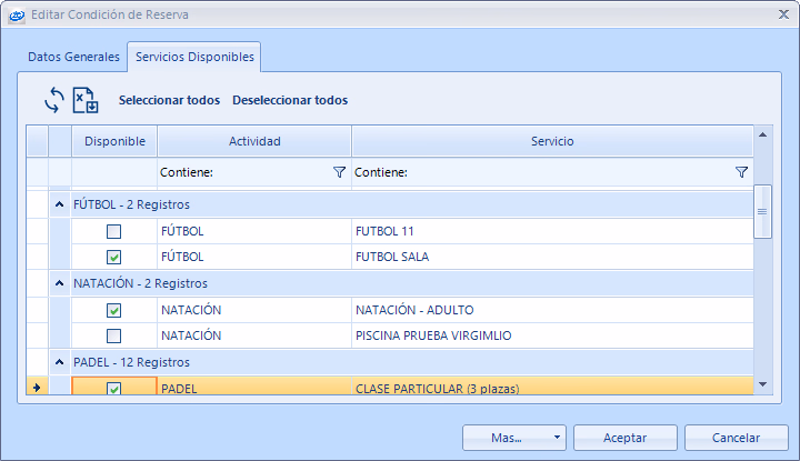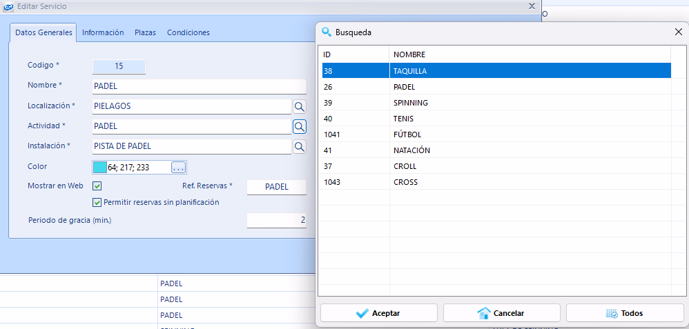 - Actividad: En la parametrización previa se crearon las Actividades, que se seleccionara a la hora de crear el Servicio de Reserva.