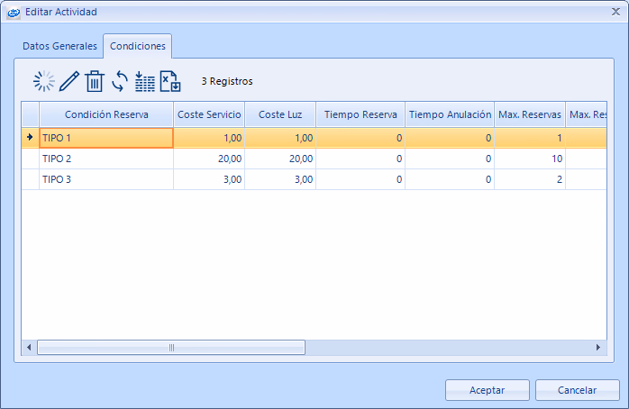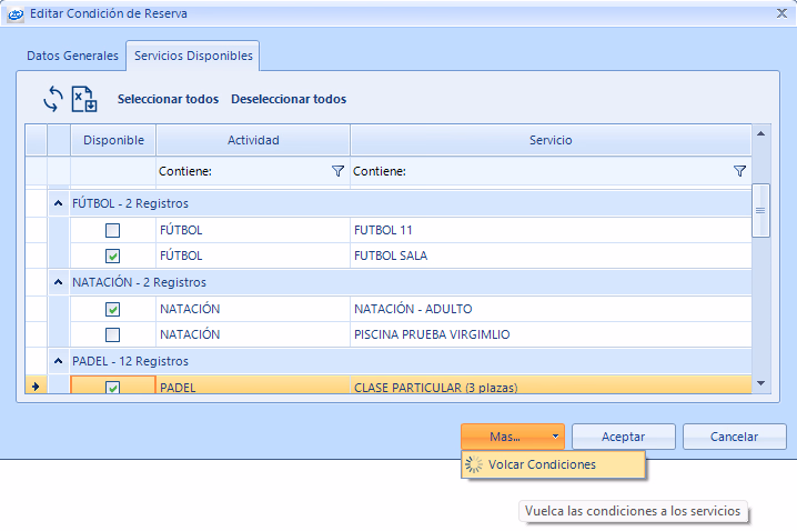 - Volcar las Condiciones a los Servicios: Si necesitas aplicar las condiciones generadas y parametrizadas a los servicios vinculados a la actividad, utiliza esta opción. Esto facilita la integración automática de las condiciones de reserva en todos los servicios asociados.
