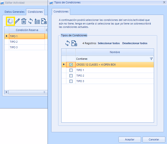 Después de crear la Actividad, vuelve a abrir el registro. Ahora verás una nueva pestaña llamada ‘Condiciones’, donde podrás generar las Condiciones de Reserva para la Actividad. Al hacer clic en el botón ‘Generar las condiciones…’, se abrirá una ventana con las condiciones de reserva disponibles, previamente creadas en el Paso 2. En el listado, podrás marcar con un check las condiciones que desees incluir en la Actividad.