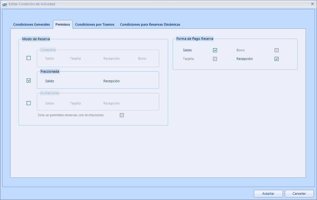 - Fraccionadas: Si solo se permite las reservas de este tipo, no se permite la Forma de Pago de Reserva por Tarjeta y Bono.
