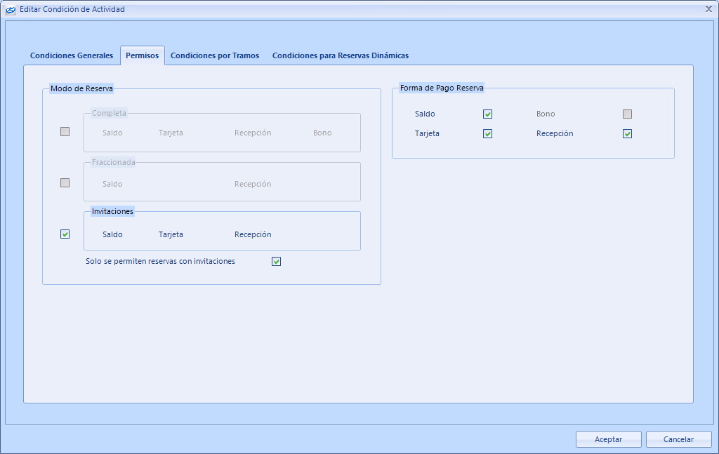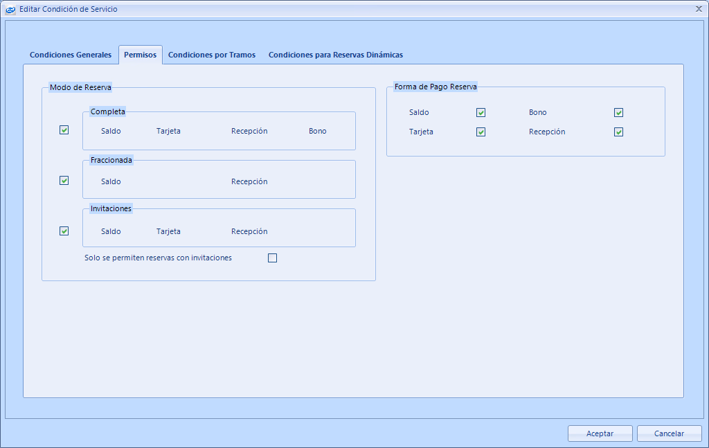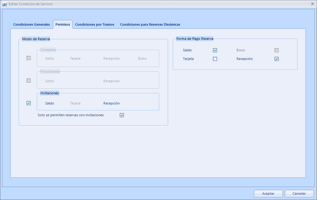 - Invitaciones: Si solo se permite las reserva de este tipo, no se permite la Forma de Pago de Reserva por Bono.