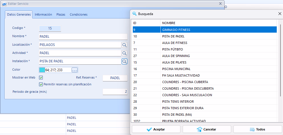 - Instalación: Si hay otro servicio de reserva con la misma instalación a la hora de crear la planificación o cuando se realicen reservas, puede existir solapamiento, ya que no se puede realizar es una misma instalación mas de 1 servicio de reserva. Ejemplo, jugar 2 partidos de Pádel en una pista a la misma hora con distintas personas.
