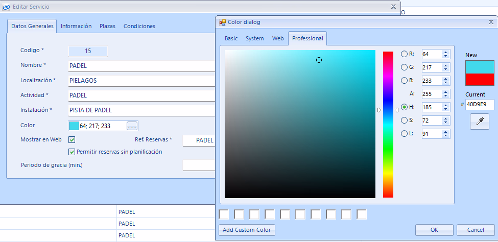 - Color: Color identificativo del Servicio de Reserva para el Calendario de la aplicación de gestión.