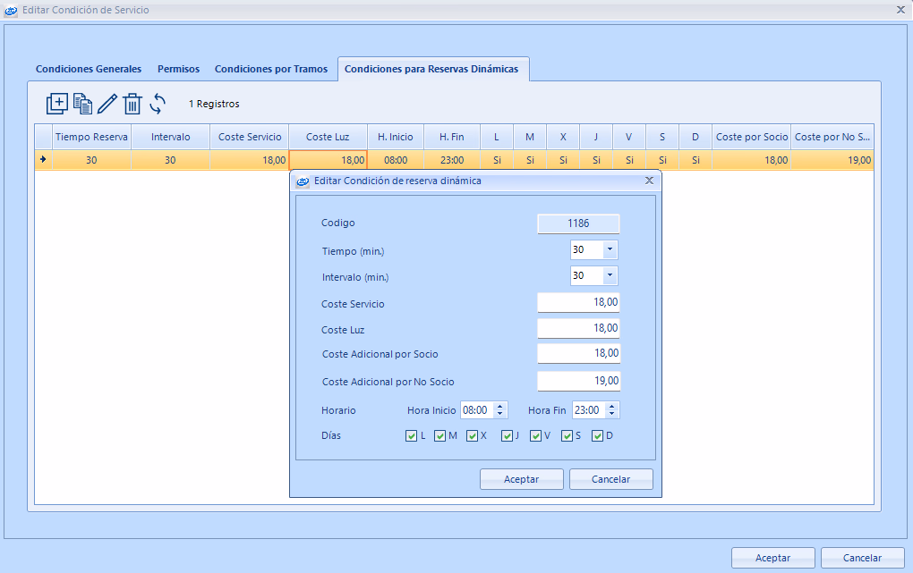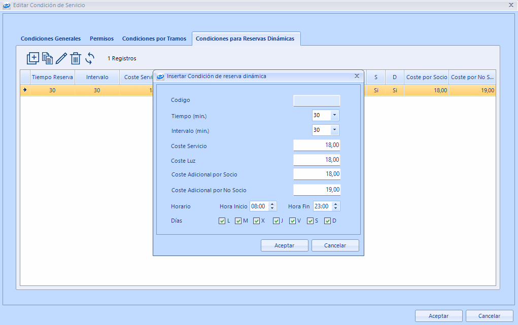 Existe un asistente el cual te permite duplicar la Condición de reserva Dinámica, es decir, si necesita de manera ágil poder crear un nueva condición, por ejemplo permitir al socio reserva en intervalos de 30 minutos con un tiempo de reserva de 30 minutos. De está manera se podrá crear nuevas condiciones de manera mucho más rápida.