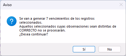 Después de seleccionar los vencimientos que deseas generar, puedes hacer clic en el botón ‘Confirmar selección y ejecutar generación automática de vencimientos’. Al pulsarlo, se iniciará el proceso para generar automáticamente los vencimientos del siguiente periodo en solo cuatro pasos.