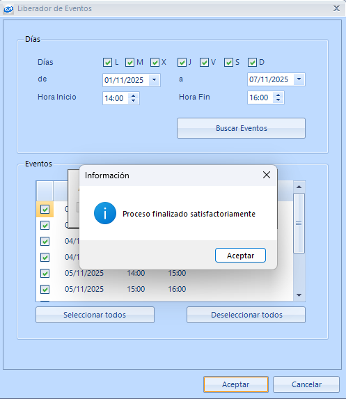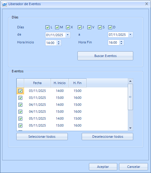 - Deseleccionar todas: Desmarca todos los días encontrados en la búsqueda que se desea liberar el evento.