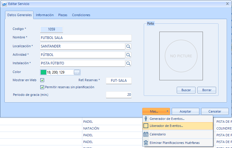 - Se abrirá el formulario para editar el servicio de reserva y el siguiente paso es darle al botón Más… y posteriormente seleccionar la opción Liberador de Eventos...