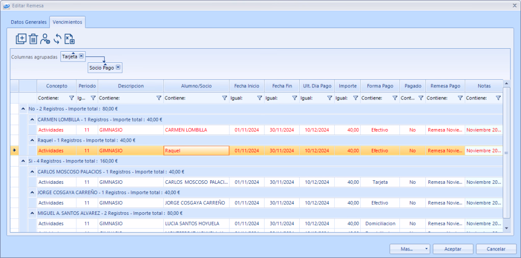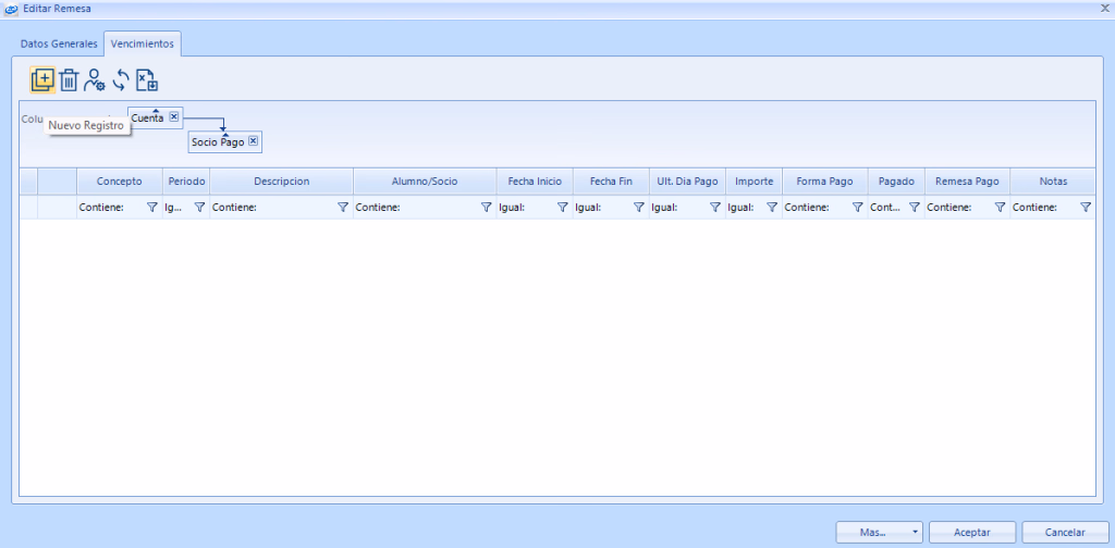 - Todas las fecha: Muestra todos los vencimientos que se han generado en el centro, sin filtrar por la fecha de emisión de la remesa.