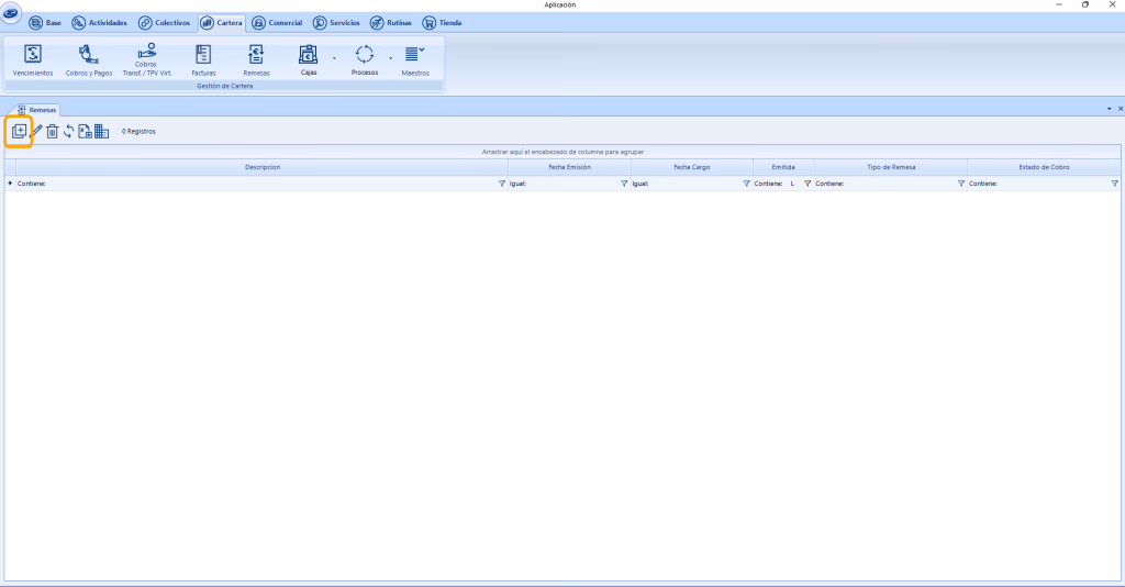 Desde el Módulo Cartera, accediendo a la sección Remesa, seleccionaremos un nuevo registro. Seguidamente se abrirá un formulario.