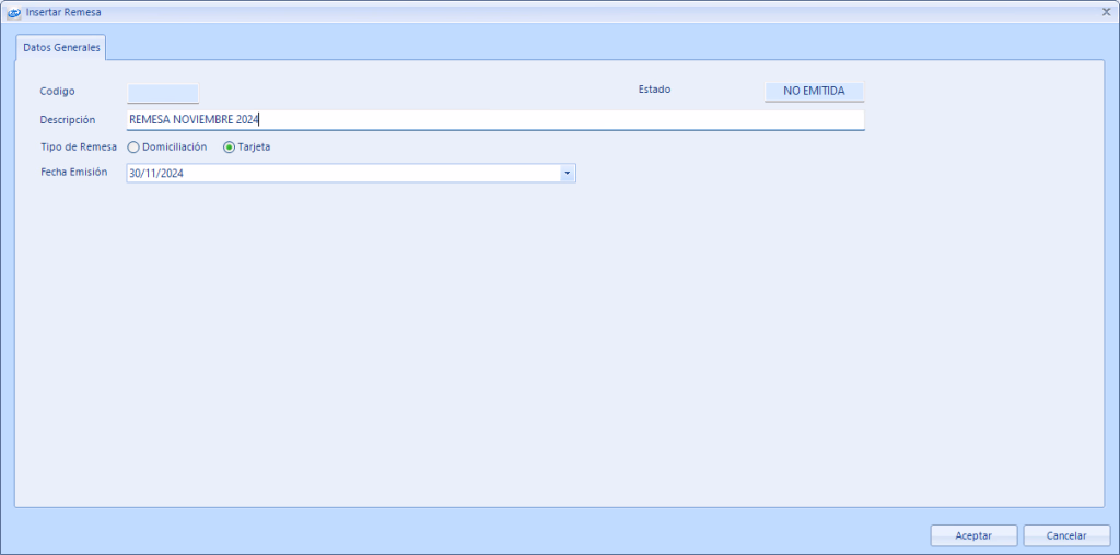 - Descripción: Nombre de la Remesa, por ejemplo «Remesa Noviembre».