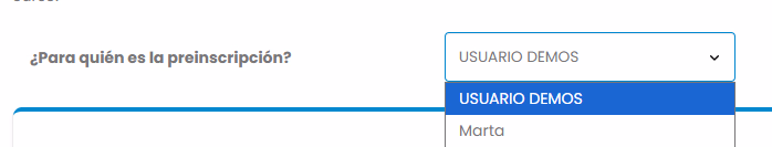 Desde el apartado Actividades, al acceder a un curso, si el usuario tiene socios vinculados, se mostrará al inicio de la página un apartado con la pregunta “¿Para quién es la preinscripción?”. Por defecto, se seleccionará el propio socio, pero a través del desplegable podrá elegir a cualquiera de los socios vinculados para realizar la preinscripción.
